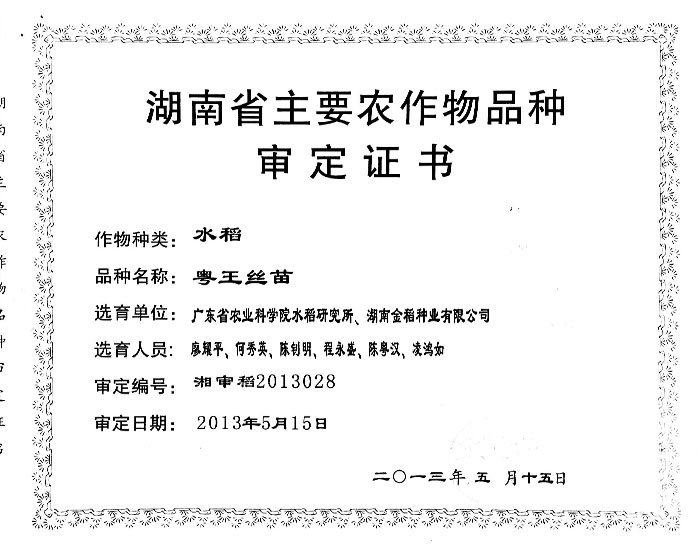 粵(yuè)王絲苗審定證書